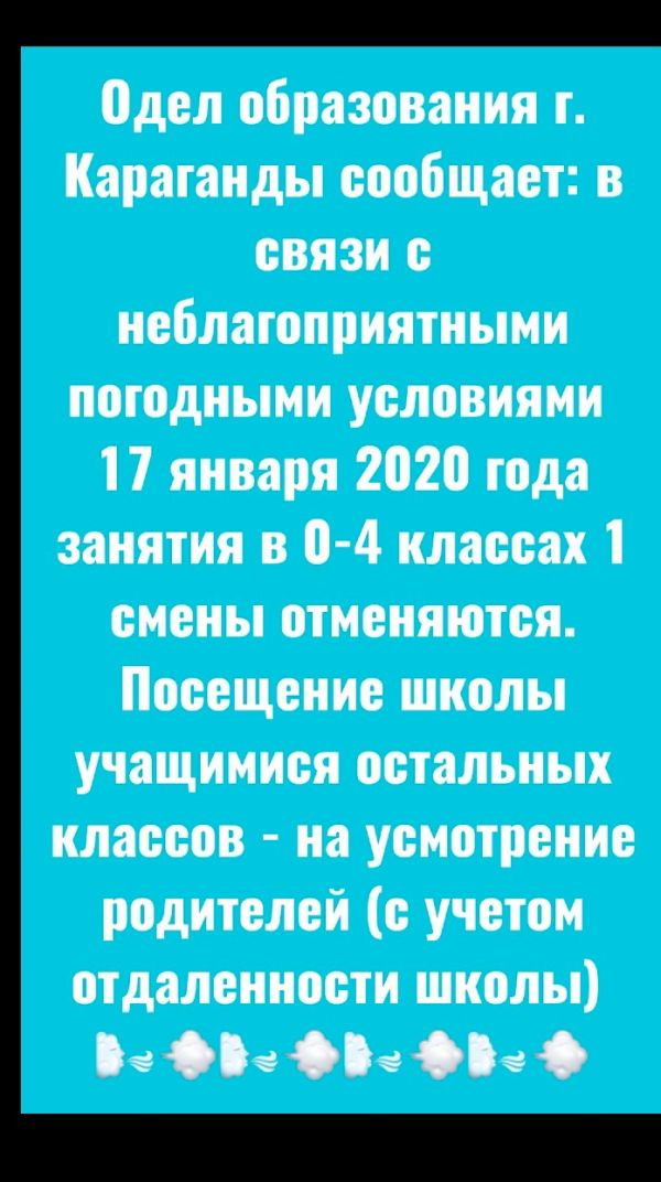 Одел образования г. Караганды сообщает: в связи с неблагоприятными погодными условиями 17 января 2020 года занятия в 0-4 классах 1 смены отменяются. Посещение школы учащимися остальных классов - на у…