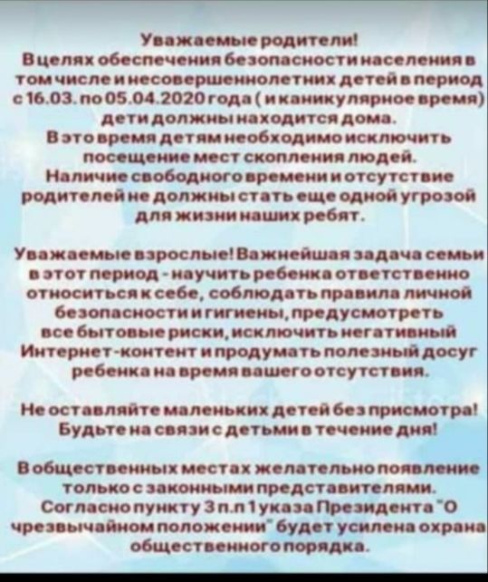 "Қарағанды қаласының білім бөлімі" ММ жарияланған карантинге байланысты сіздің балаларыңыздың бос уақытын дұрыс өткізуіне бақылауды күшейтуді және ересектердің ертіп жүруінсіз көшеде жүруіне жол бер…
