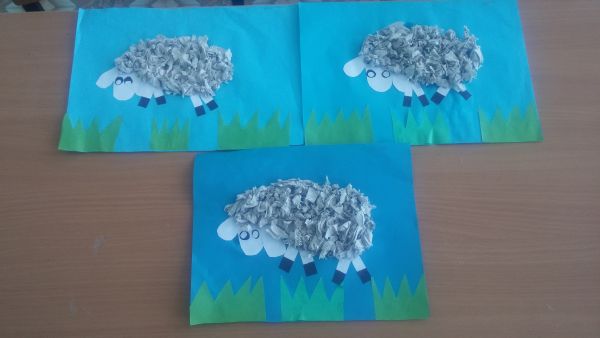 Мектепалды даярлық тобының оқушылары жапсыру сабағында үй жануары және төрт түліктің бірі - қойды түрлі-түсті қағаздардан жасады.