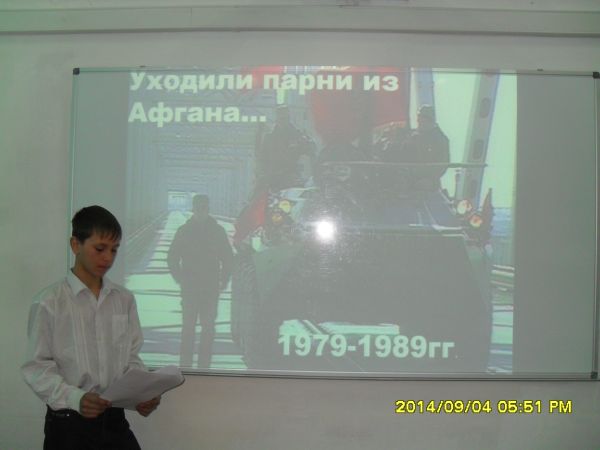 Кеңес әскерлерінің Ауғаныстан жерінен шығарылғанына 26 жыл толуына орай 5-6 сыныптың сынып жетекшісі Мұқышева М. К. "Ерлік-ұрпаққа мұра" тақырыбында сынып сағатын өткізді. Мақ…