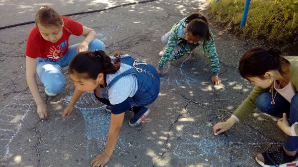 Сегодня ребята из пришкольного лагеря рисовали на асфальте на тему "20 лет Астане"