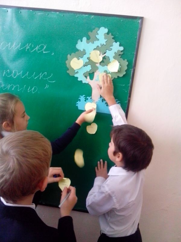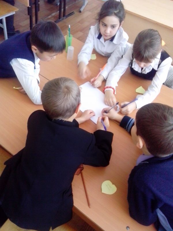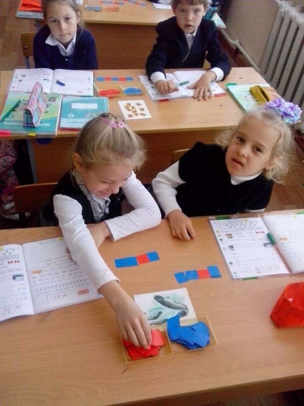 На уроке математике первоклассники учились работать в группах. Ребятам понравилась работа в группах.