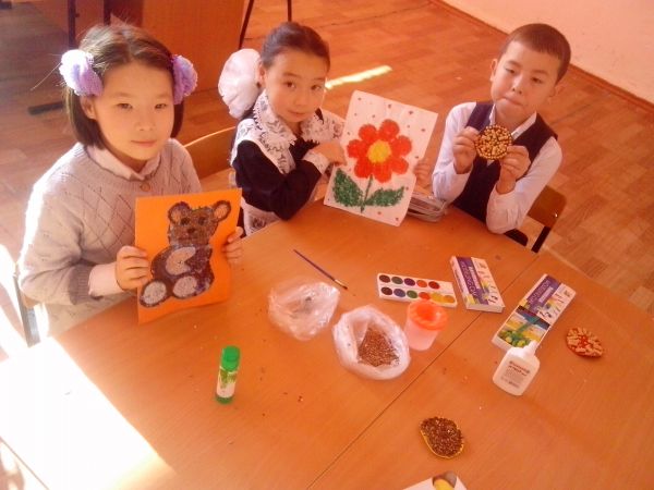 № 40 негізгі мектебінің 2-3 қазақ сыныбында еңбекке баулу сабағында оқушылар дәнді - дақылдардан жұмыс жасады.