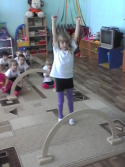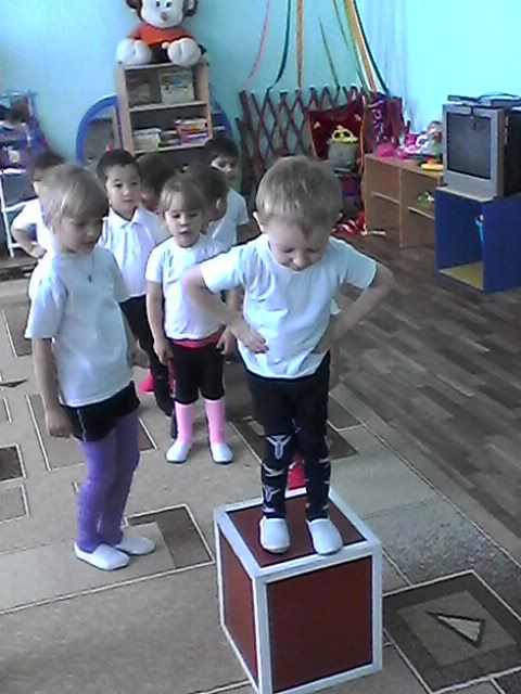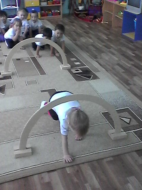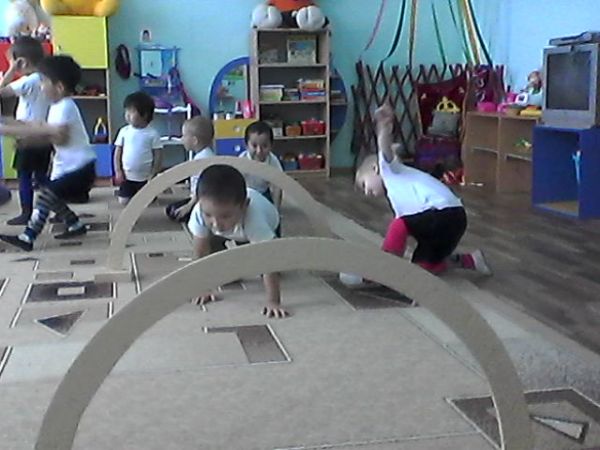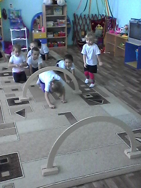 Формировать умение прыгать на двух ногах. Упражнять детей в ходьбе в прямом направлении, перешагивать через мешочки с песком («камушки»); ползать на четвереньках, подползать под…