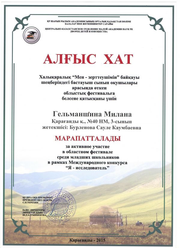 Халықаралық «Мен –зерттеушімін» байқауы шеңберіндегі бастауыш сынып оқушылары арасында өткен облыстық фестивальға белсене қатысқаны үшін 3 сынып оқушылары Исакиев Ислам, Гельманшин…