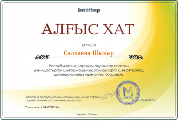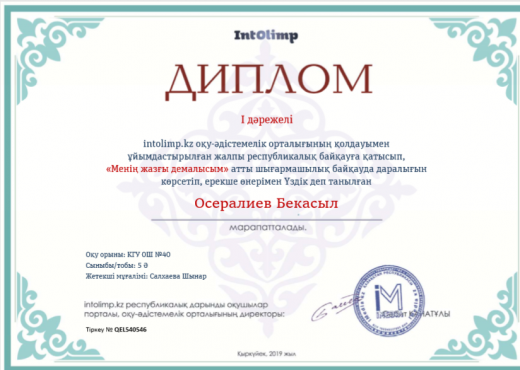 "Менің жазғы демалысым" атты шығармашылық республикалық байқау қатысып ерекше өнерімен дараланған 5 "ә" сынып оқушысы Осералиев Бекасыл I дәрежелі дипломмен. Же…