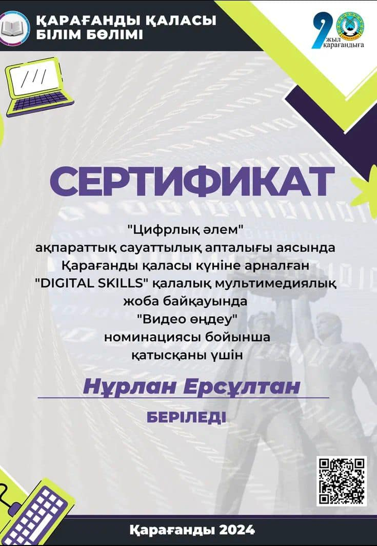“Цифрлық әлем” ақпараттық сауаттылық апталығы аясында Қарағанды қаласы күніне арналған “Digital Skills” қалалық мультимедиялық жоба байқауында “Видео өңдеу” номин…