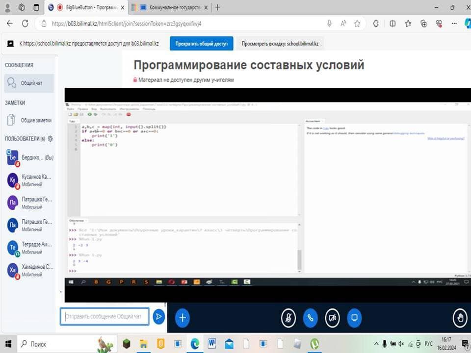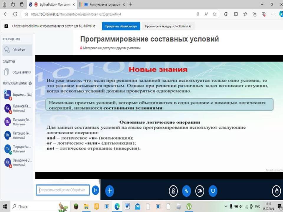 16 ақпан күні ауа-райының қолайсыздығына байланысты 7"В" сыныбында информатика пәнінен «Құрамды шарттарды бағдарламалау» тақырыбында қашықтықтан сабақ өткізілді.