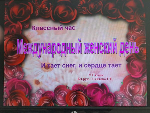 7 наурызда 9Г сыныбында Халықаралық әйелдер күні мерекесі қарсаңында "Қар да ериді, жүрек те жібиді" тақырыбында сынып сағаты өтті.