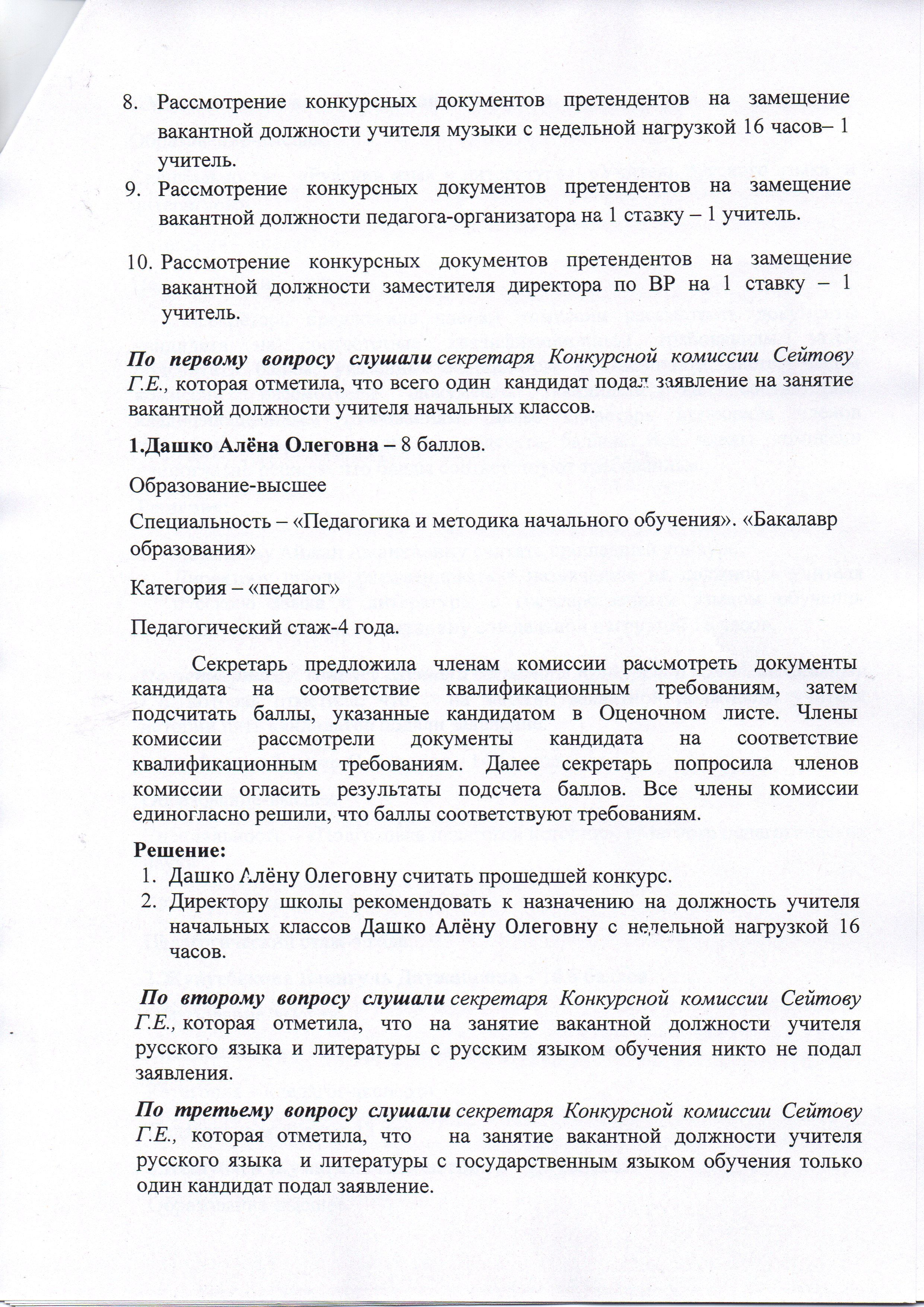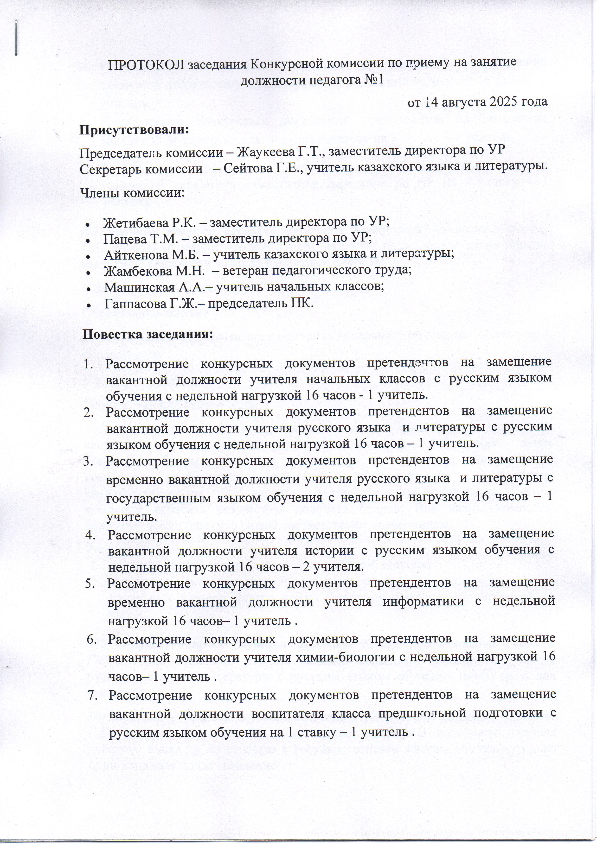 №1 педагог лауазымына орналасуға қабылдау жөніндегі конкурстық комиссия отырысының хаттамасы