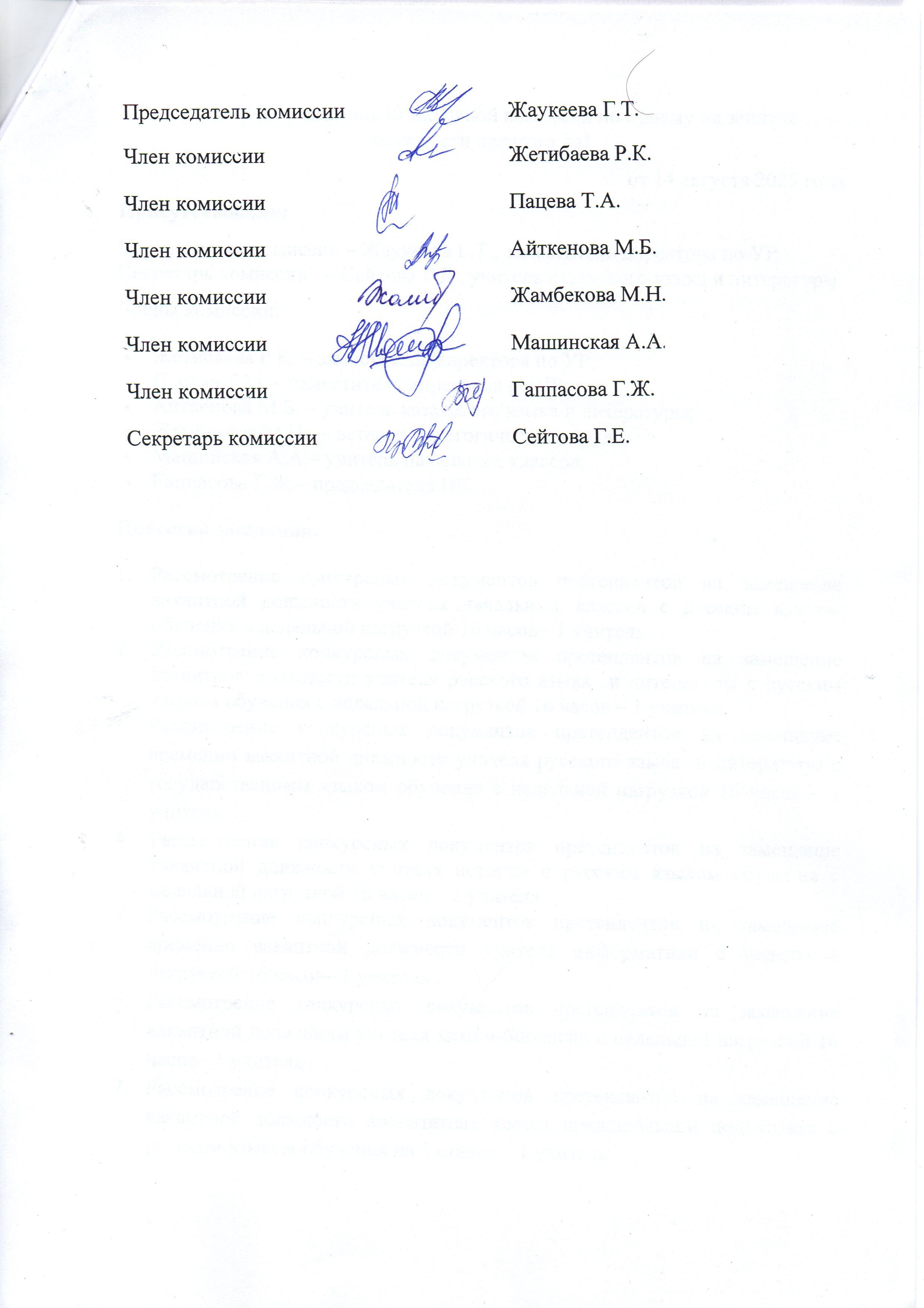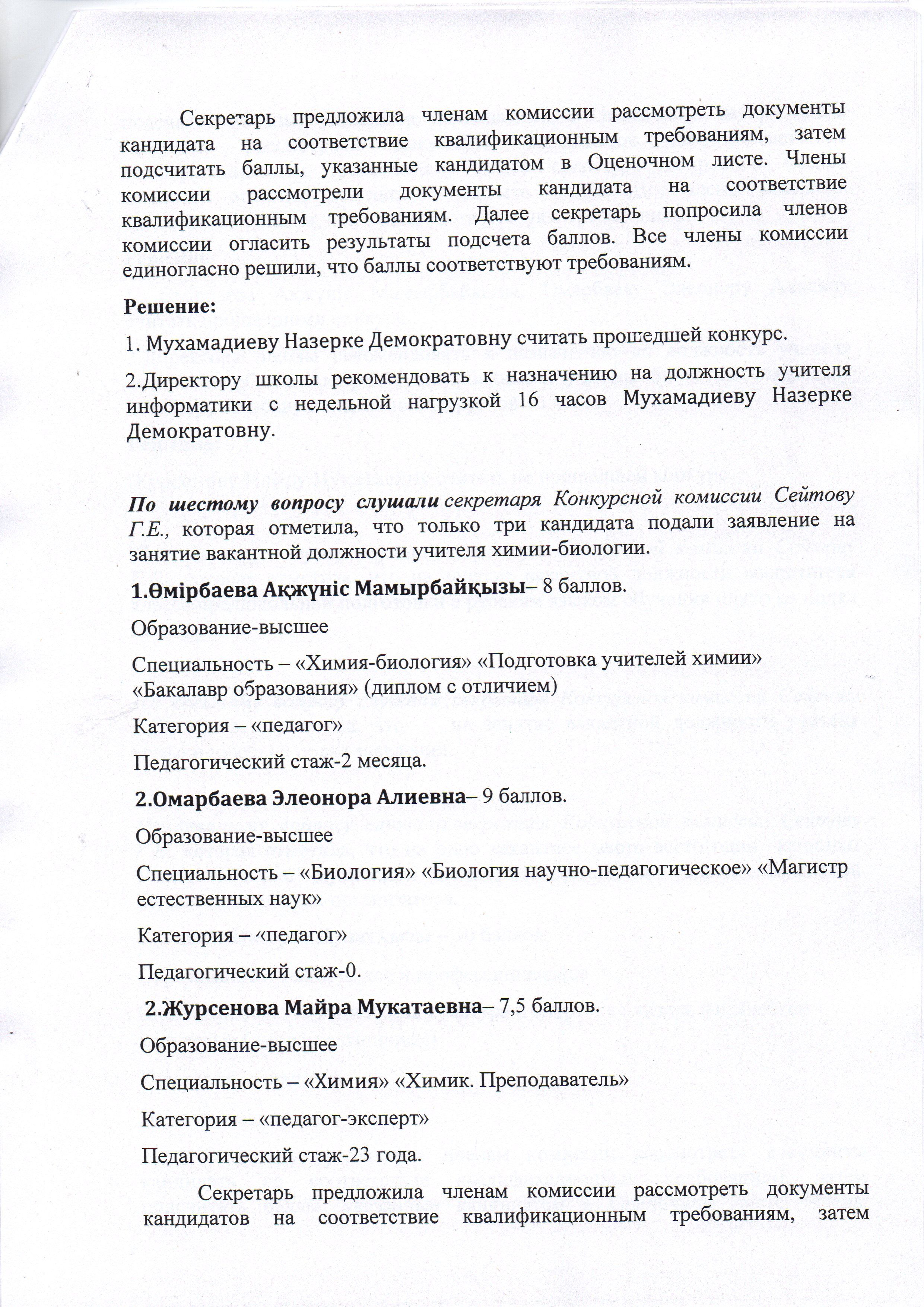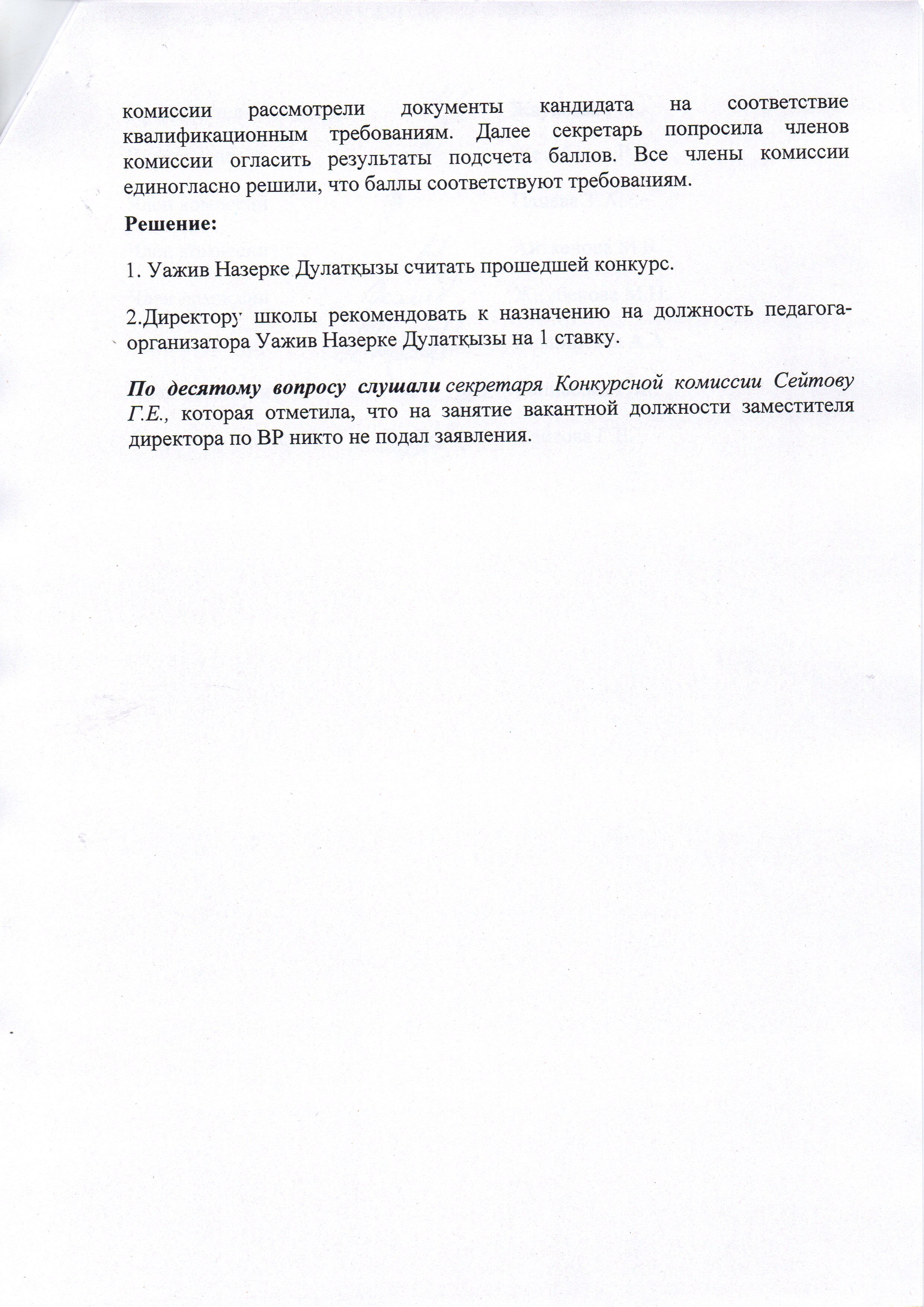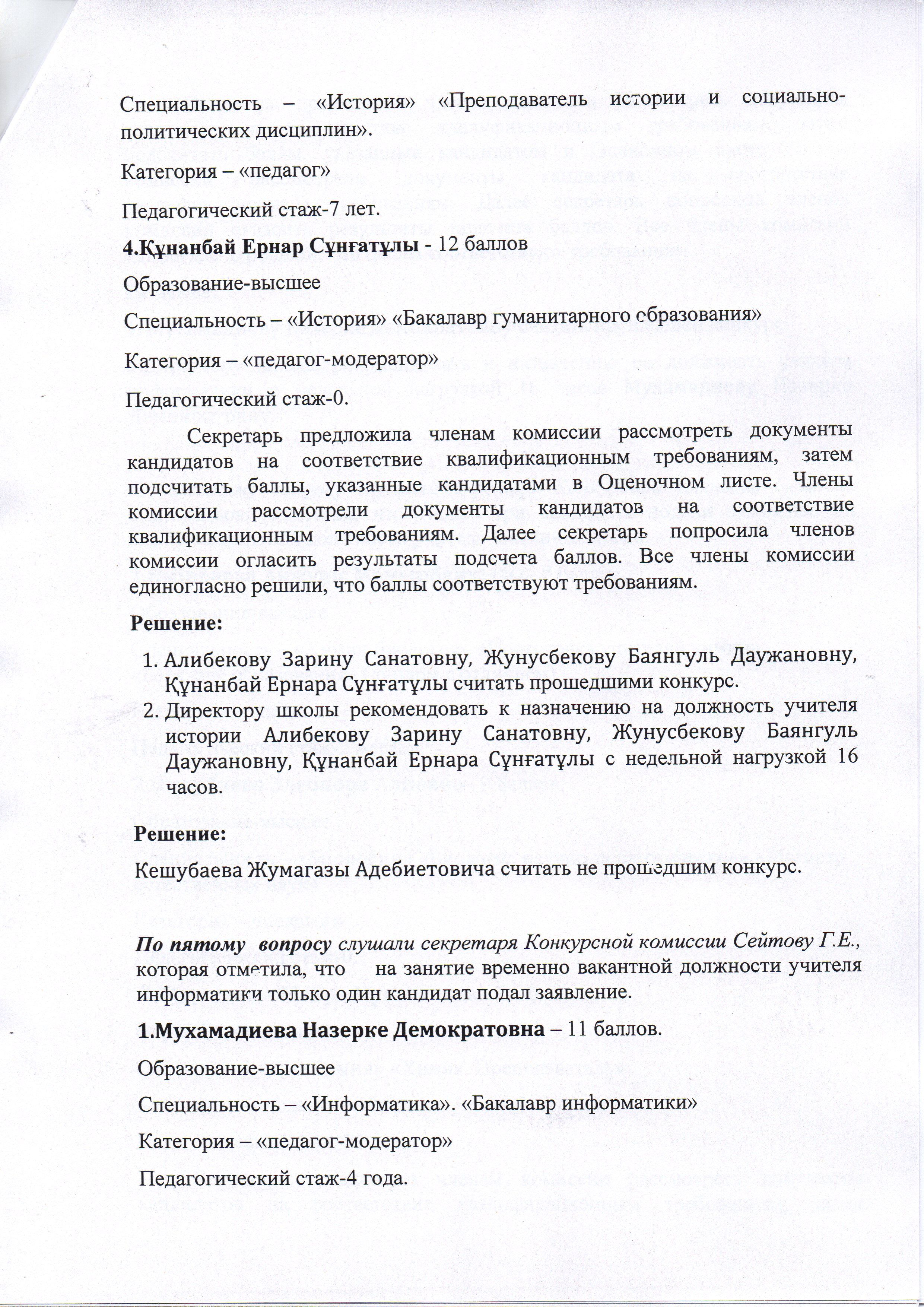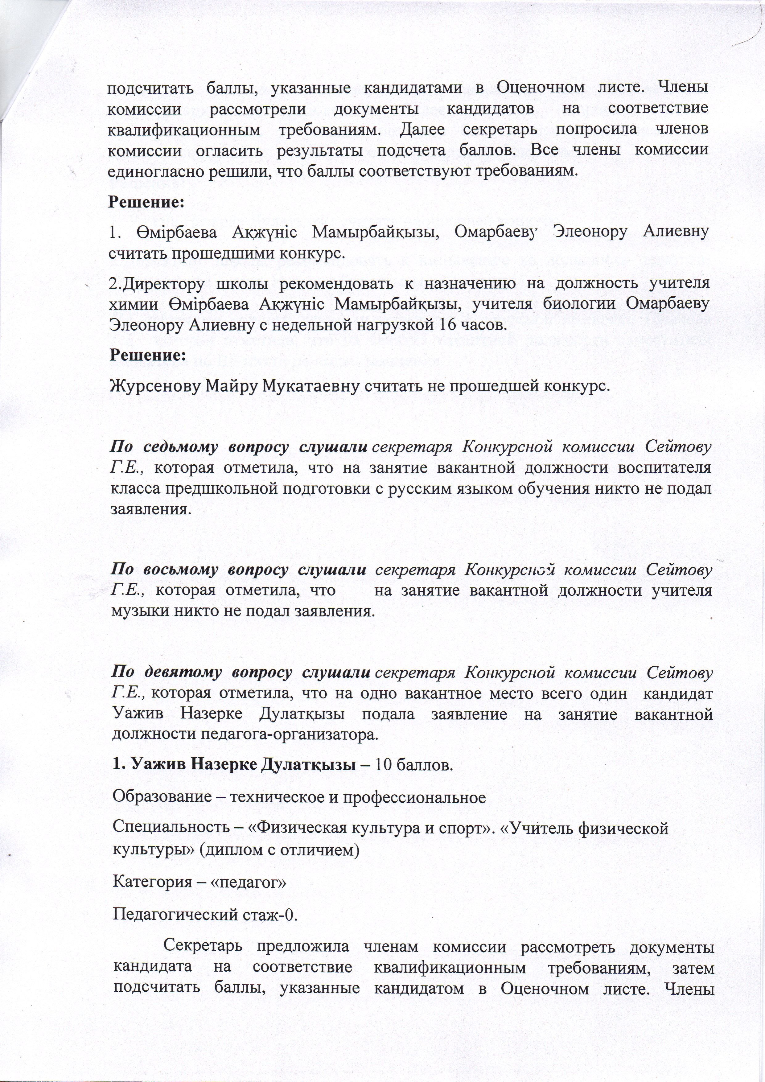 №2 педагог лауазымына орналасуға қабылдау жөніндегі конкурстық комиссия отырысының хаттамасы