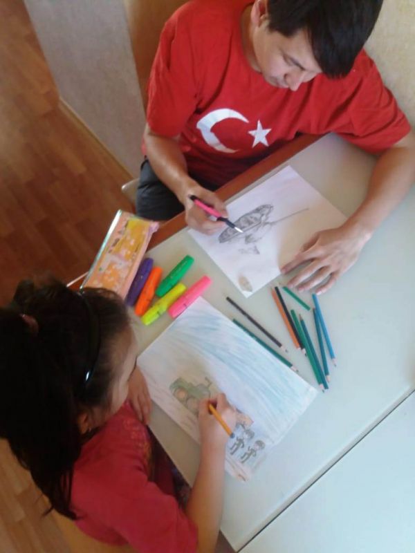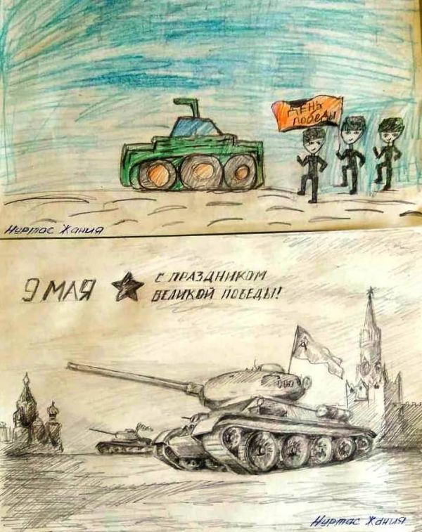 2В сыныбының оқушысы Нұртас Жания әкесімен бірге Жеңіс күніне арналған сурет салды.