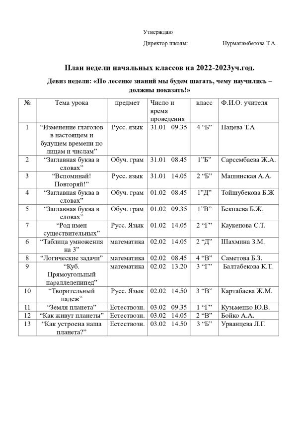 С 30.01.2023г. по 03.02.2023 года, пройдёт неделя начальных классов с русским языком обучения. В рамках недели пройдут открытые уроки, внеклассные мероприятия, выставки.