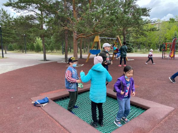 Лагерь "Достық". 2-день. Второй день летнего лагеря "Достық" дети начали с зарядки. Затем в спортзале играли в спортивные игры. Потом в парке Победы играли в весёлые игры.