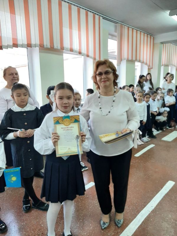 Победители городского творческого конкурса, посвященного Дню Республики Казахстан "Казахстан глазами детей": Перзадаева Алсу 1"Д" класс и Бейбит Муслим 3"А" класс.