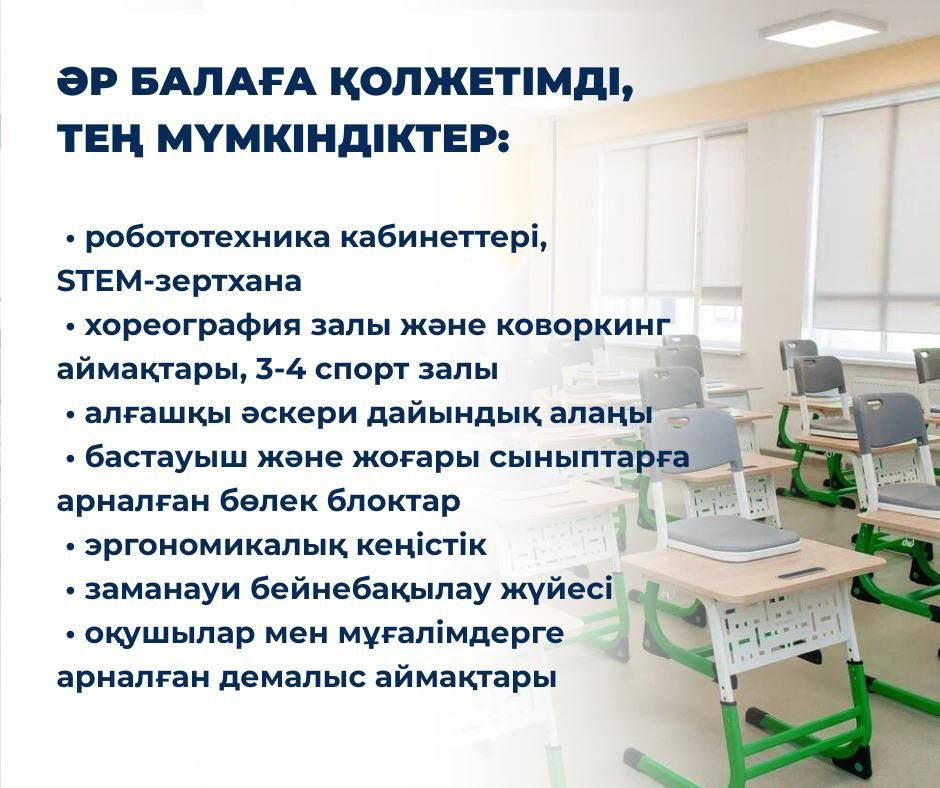 2022 жылдың қыркүйегінде Мемлекет басшысы әрбір қазақстандық оқушының білім алуы мен жан-жақты дамуы үшін лайықты жағдай жасалуы керектігін атап өтті. Сол үшін «Келешек мектептері» ұлтты…