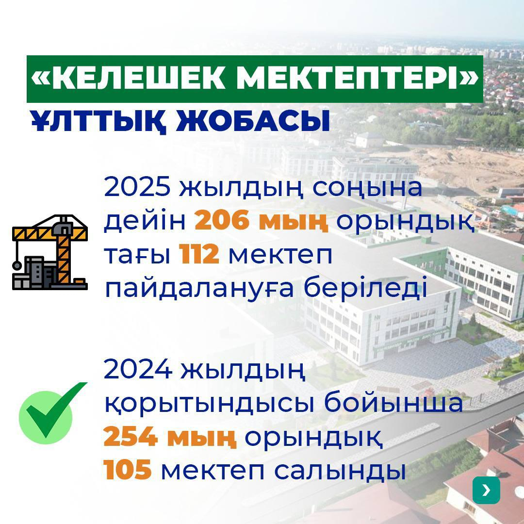 В стране активно реализуется национальный проект «Келешек мектептері», инициированный Главой государства. В 2024-2025 учебном году уже введено в эксплуатацию 105 школ нового формата на 2…