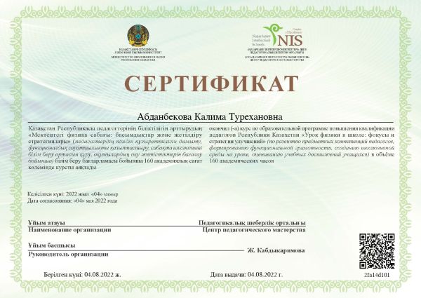 В период летних каникул Центром педагогического мастерства АОО "Назарбаев Интеллектуальные школы" был проведен курс по физике в объеме 160 академических часов. Учитель-участник: Абданбеко…