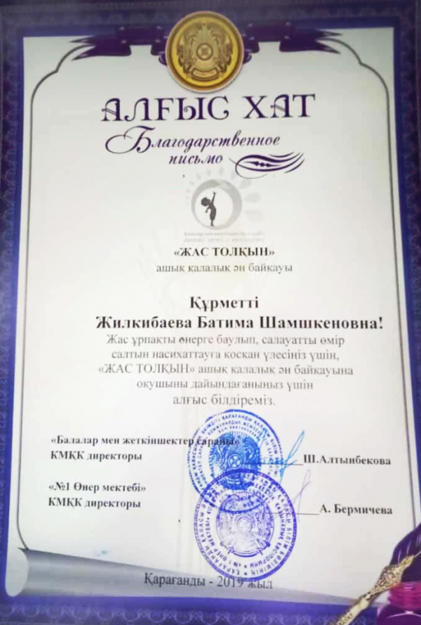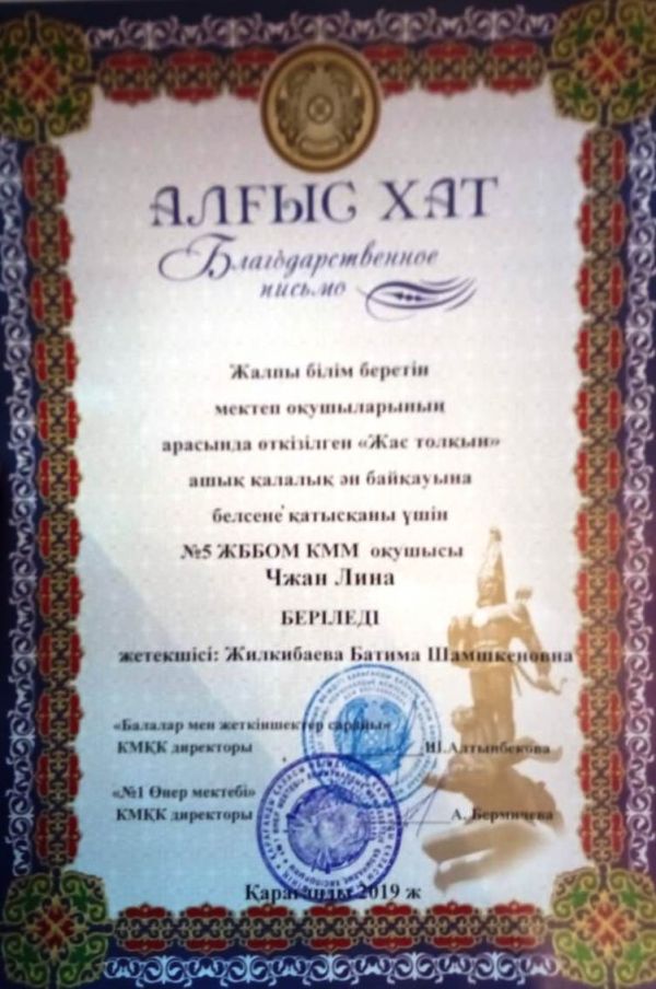 2019 жылдың 08 ақпанында балалар мен жеткіншектер сарайында "Жас толқын" қалалық байқауы өтті, оған біздің мектептің 5 "В" сынып оқушысы Чжан Лина және 8 "А" сынып оқуш…