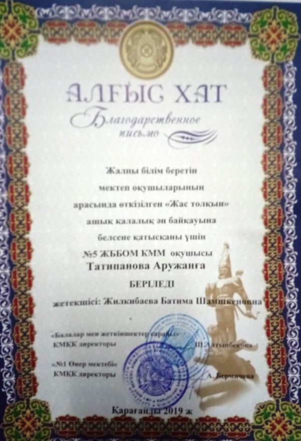 11.02.2019 жылы 9 «А» сыныбында Қарағанды қаласының 85 жылдық мерейтойына орай ашық сынып сағаты өтті. Оқушылар топтық жұмыста өз қалалары жайлы қабырға қағазын жасап, оны қорғады, өз бі…