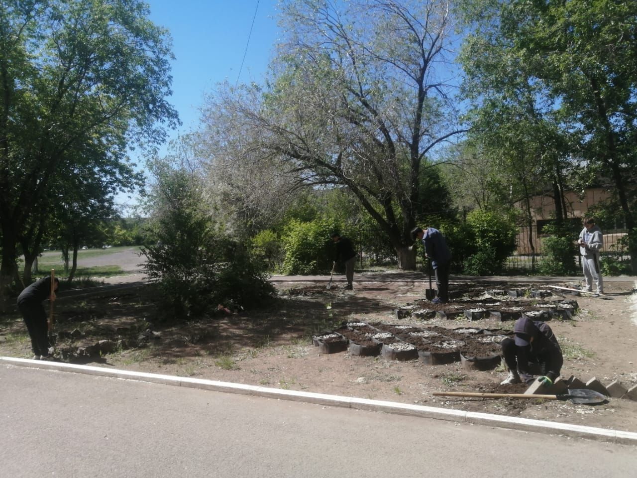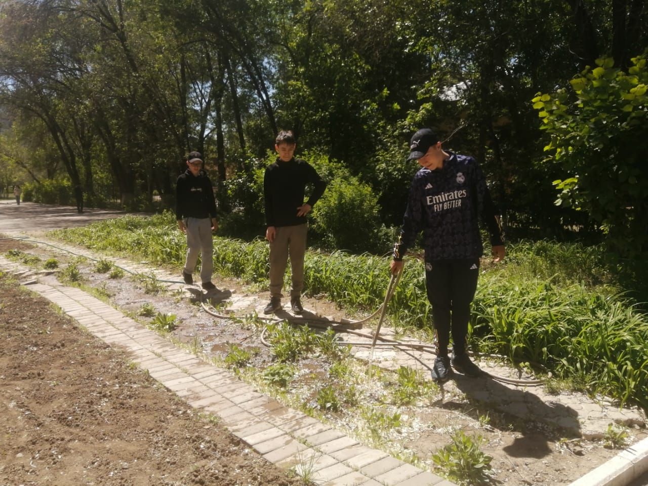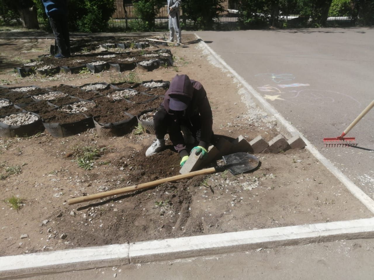 Мектеп жанындағы аумақты көгалдандыру жұмыстары жалғасуда. Кесте бойынша 8Б және 8В сынып оқушылары шығады.