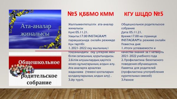 Құрметті ата-аналар! №5 ҚББМО КММ - 05.11.2021 күні сағат 17.00 жалпымектепшілік ата-аналар жиналысы онлайн режим түрінде өтеді.