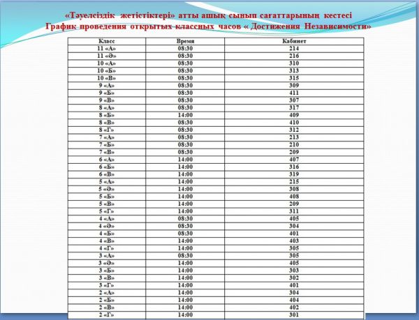«Тәуелсіздік жетістіктері» атты ашық сынып сағаттарының кестесі.