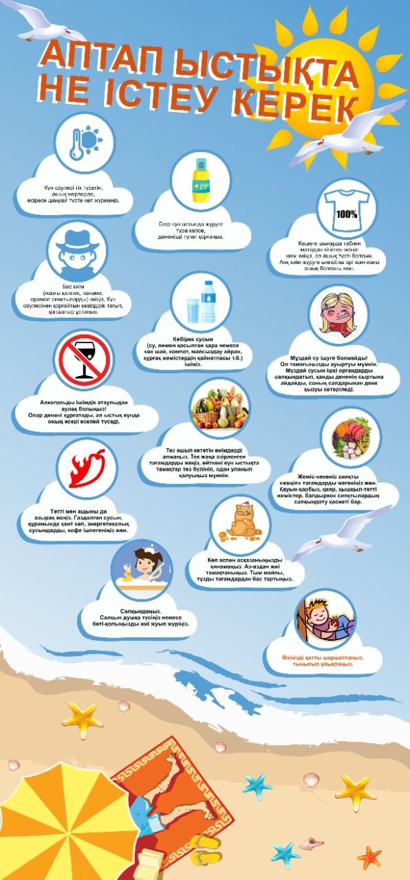 Жазда судағы қауіпсіздік техникасы ережелерін, қатты ыстықта қауіпсіздік техникасы ережелерін, күн соққанда қауіпсіздік техникасы ережелерін сақтау керек.