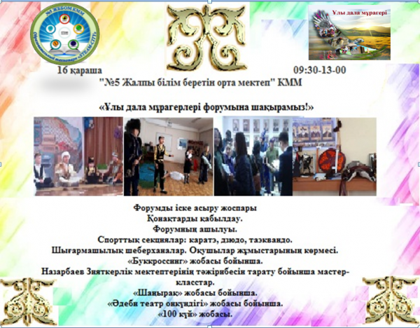 №5 ЖББОМ-бі қараша айының 16 жұлдызында "Ұлы дала мұрагерлері" атты форумға шақырады!