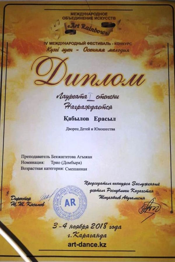 2018 жылдың 3-4 қараша аралығында Қарағанды қаласында өткен халықаралық Күзгі әуен байқауына 9 А сынып оқушысы Қабылов Ерасыл ТРИО (домбыра) номинациясы бойынша қатысып жүлделі I- орынға ие болуымен…