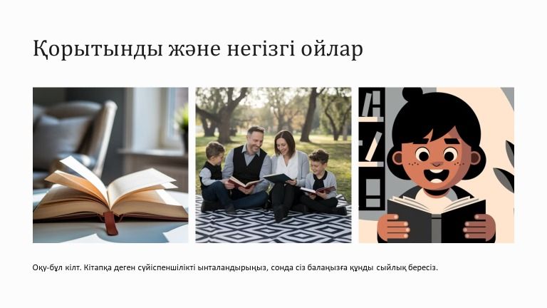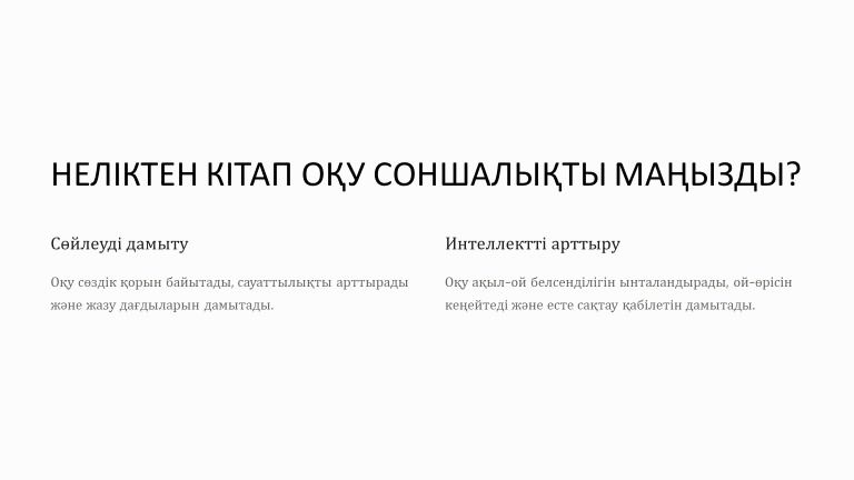ОҚУ САУАТТЫЛЫҒЫНЫҢ АПТАЛЫҒЫ Оқу сауаттылығы аптасының аясында 11"В" сынып оқушысы Орт Ада "Кітап оқуға қызығушылықты арттыру жолдары" атты презентация дайындады. Пән мұғалімі -…