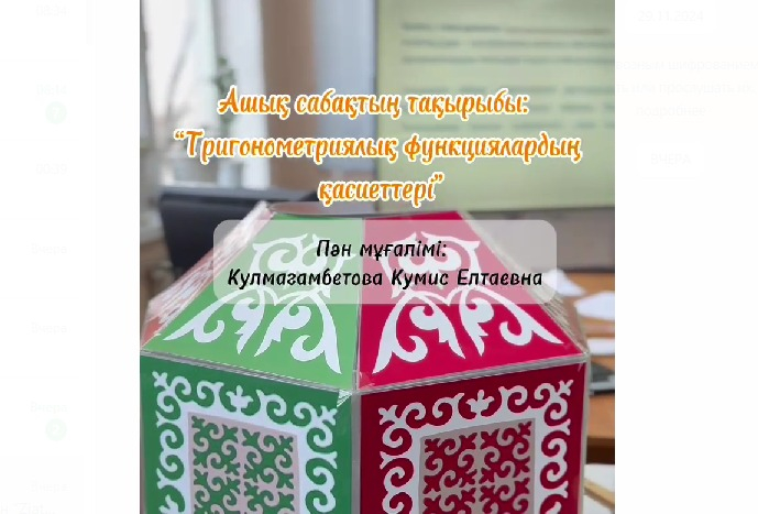 22.01.2025 ж. Қалалық білім бөлімінің бастауымен "Ziatkerlik modernizasia” жобасы аясында 9«Ә» сыныбында алгебра пәнінен «Тригонометриялық функциялардың қасиеттері»…