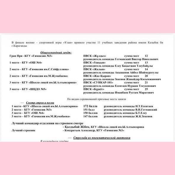 Қарағанды қаласы Қазыбек би атындағы ауданның білім ошақтары арасында өткен «Ұлан» әскери-спорттық ойынында оқушыларымыз ІІІ орынға ие болды.