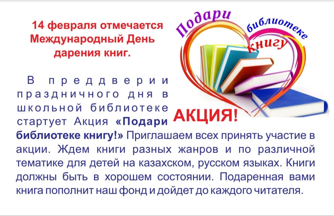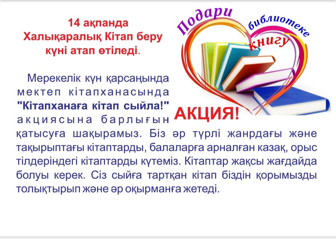 «Оқуға құштар мектеп» жоба аясында «Халықаралық Кітап Сыйлау» күніне байланысты кітапханаға кітап сыйлауға шақырамыз.