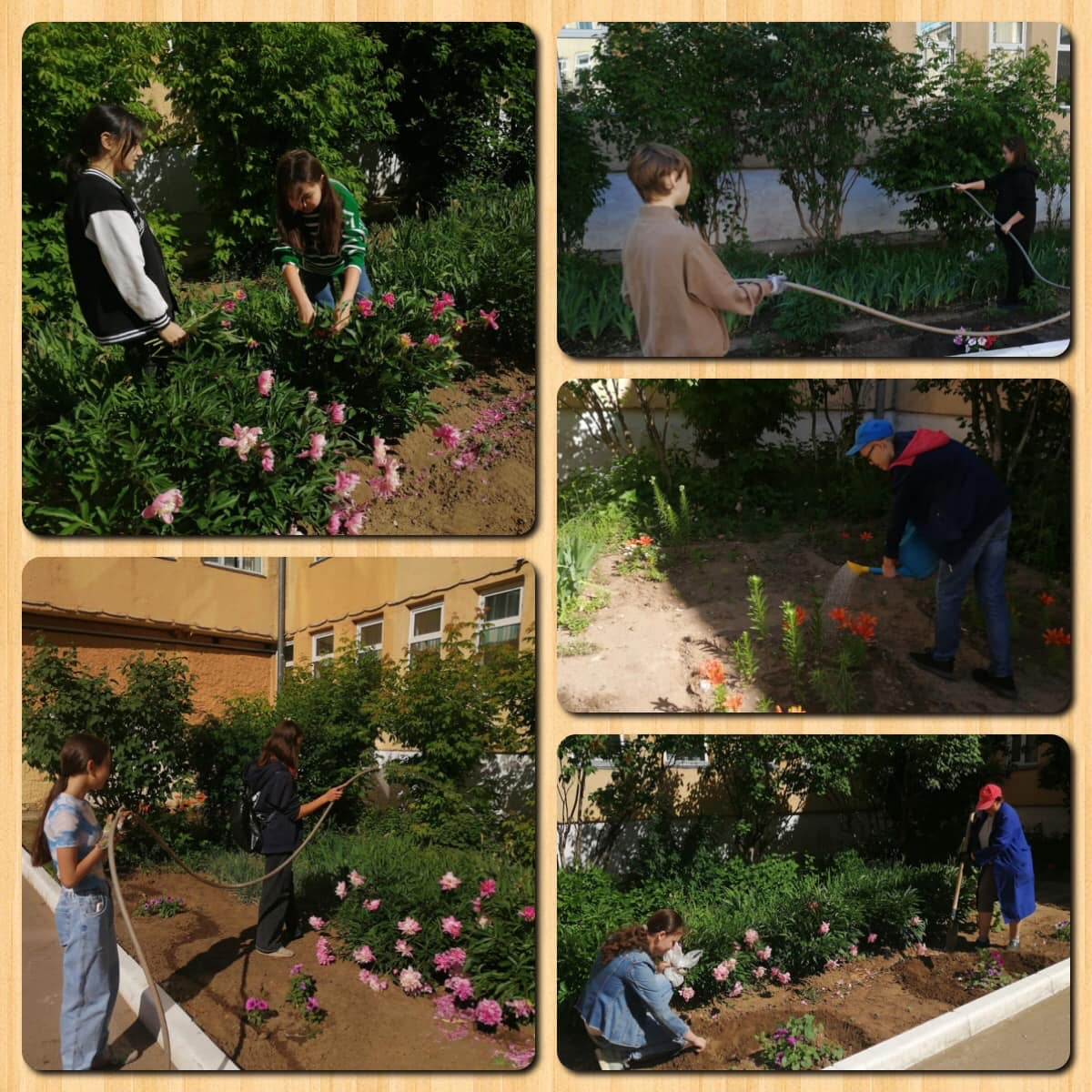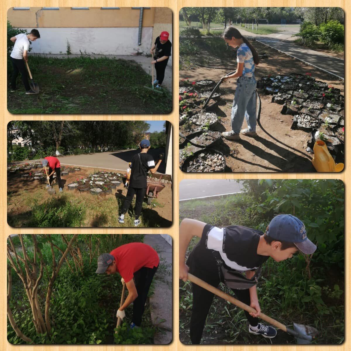Мектеп жанындағы учаскеде Бушман Людмила Николаевнаның жетекшілігімен 7В сынып оқушылары өсімдіктерді суарып, топырақты қопсытып, гүлдер егіп, арамшөптерді алып тастады.