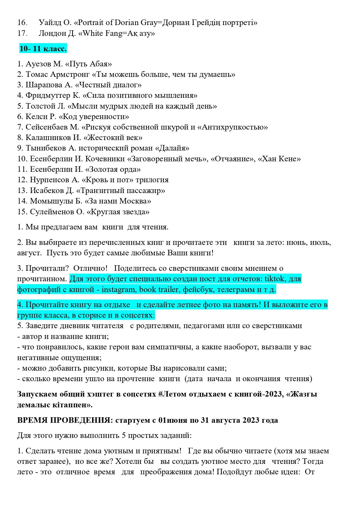 2023 жылдың 1 маусымы мен 31 тамызы аралығында мектеп кітапханашылары «Оқуға құштар мектеп» жобасы аясында «Жазғы демалыс кітаппен» акциясын ұйымдастыру барысында 1-11 сынып…