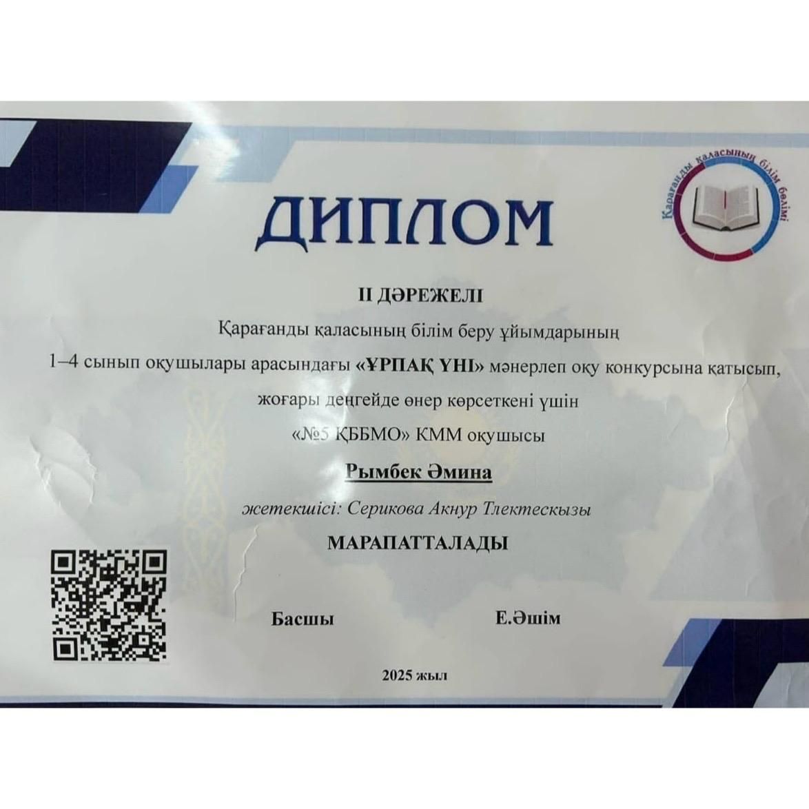 1-4 сыныптар арасында "Ұрпақ үні" мәнерлеп оқу бойынша ІІ орын алған 4"А" сынып оқушысы Рымбек Әминаны құттықтаймыз! Жетекшісі: Серикова А.Т.