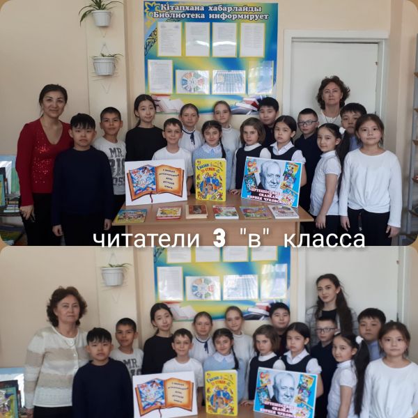 2022 жылдың 7 сәуірінде «Оқуға құштар мектеп» жобасы, «Балалар кітаптарының апталығы» аясында 3«В» сынып оқушылары Е.Липинская, Д.Олейников, В.Мащинкова В; А.Серг…