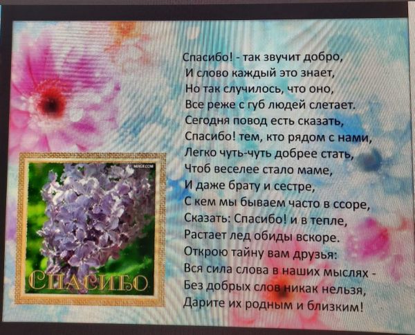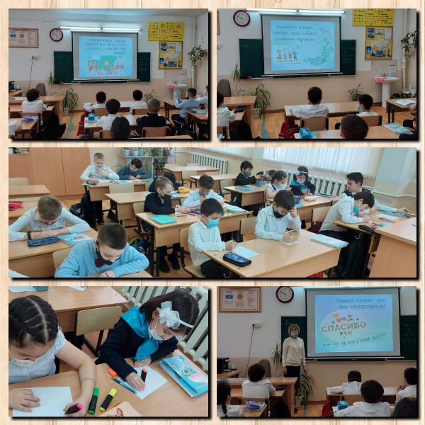 Алғыс айту күніне арналған сынып сағаты 4"Г" сыныбында өтті, онда балалар алғыс гүлін салып, ата-аналарына сыйлауды шешті.
