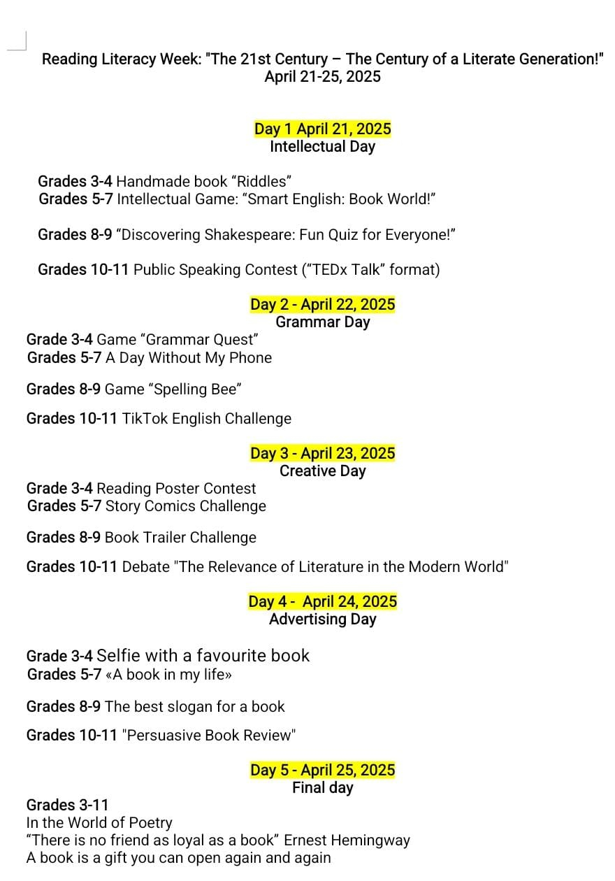 14 сәуірде 6-11 сынып оқушылары халықаралық «Страница-25» оқу чемпионатына қатысты. Жоғары сынып оқушылары арасында байқаудың мектепішілік кезеңінің жеңімпазы Чжан Лина атанды.