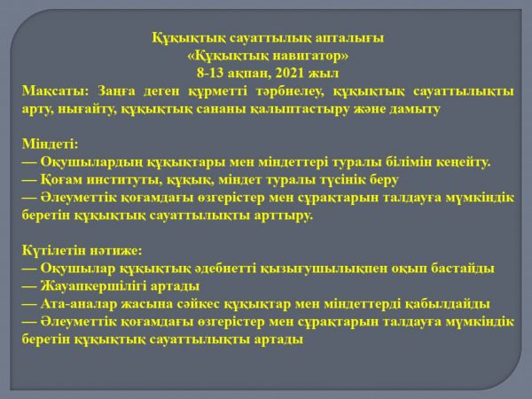 ұқықтық навигатор» атты құқықтық сауаттылық апталығы шеңберінде 8 «А» сыныбында "Жасөспірімнің құқықтары мен міндеттері» тақырыбы бойынша сынып сағаты ұйымдастырылып өтк…