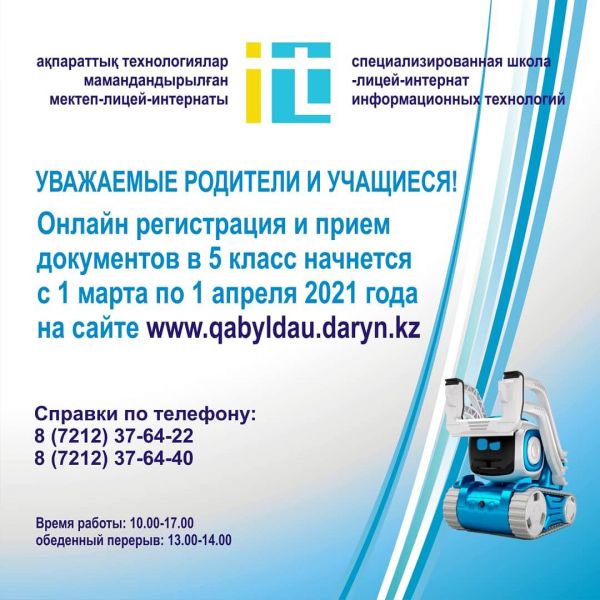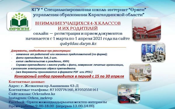 2021 жылдың 1 наурыз - 1 сәуірі аралығында республика бойынша 2021-2022 оқу жылына мамандандырылған білім беру ұйымдарына қабылдау басталады.