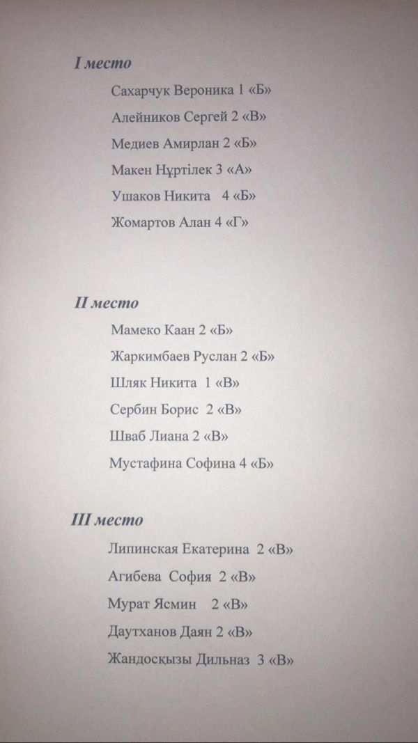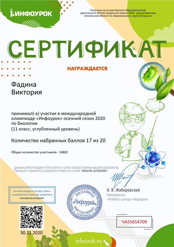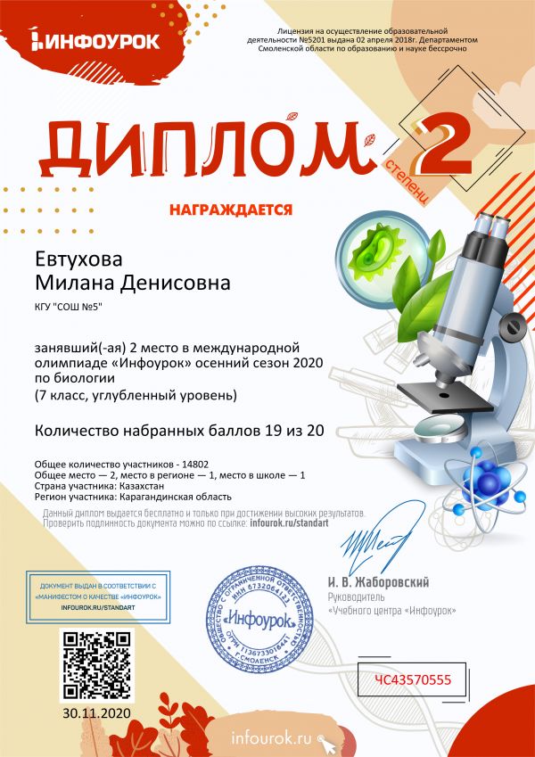 Біздің мектептің оқушылары биология пәнінен 2020 жылғы күзгі маусымдағы Халықаралық «Инфоурок» олимпиадасына қатысып, 7Г сынып оқушысы Евтухова Миланада ең жақсы нәтиже болды