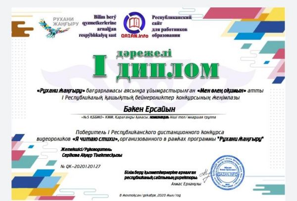 «Рухани жаңғыру» бағдарламасы аясында ұйымдастырылған «Мен өлең оқимын» атты І Республикалық қашықтық бейнероликтер конкурсына кіші топ номинациясы бойынша қатысқаны үшін, №5…