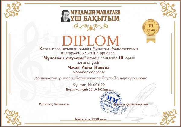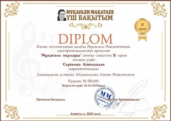Республикалық "Мұқағали оқуларына" қатысып, жүлделі 2 орын алған 8А сынып оқушысы Серікова Айтолқынды жəне дайындаған ұстазы Абдикешова Айман Мажитовнаны, жүлделі 3 оры…