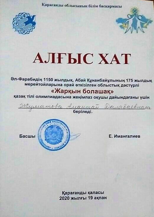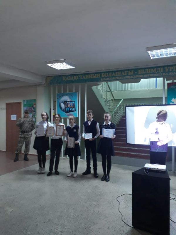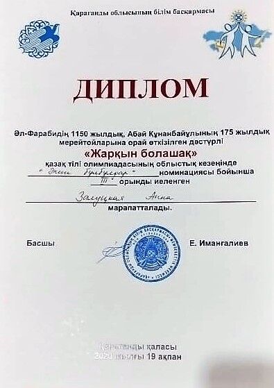 2020 жылдың 30-шы қаңтарында мектебіміздің 7«Б» сынып оқушысы Залуцкая Анна Республикалық «Жарқын болашақ» қазақ тілі олимпиадасының қалалық кезеңінде «Әнші – бұл…
