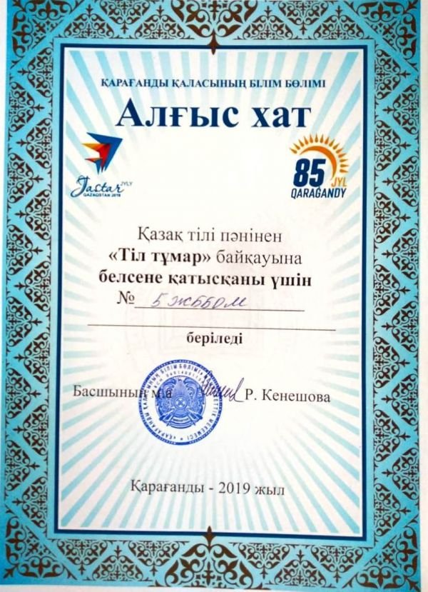 «Рухани жаңғыру және Ұлы даланың жеті қыры» бағдарламасы аясында тарих пәні мұғалімдеріне арналған облыстық форумы аясында өткізілген көрмеге белсене қатысып, шығармашылық танытқаны үшін…