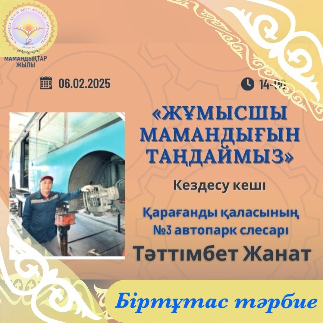 2025 жылдың 6 ақпанында 2025 жылы - жұмысшы мамандықтарын қолдау жылы және «Біртұтас тәрбие» жобасы аясында №29 филиалмен бірлесіп 9-сынып оқушыларына «Жұмысшы мамандығын таңдаймыз…