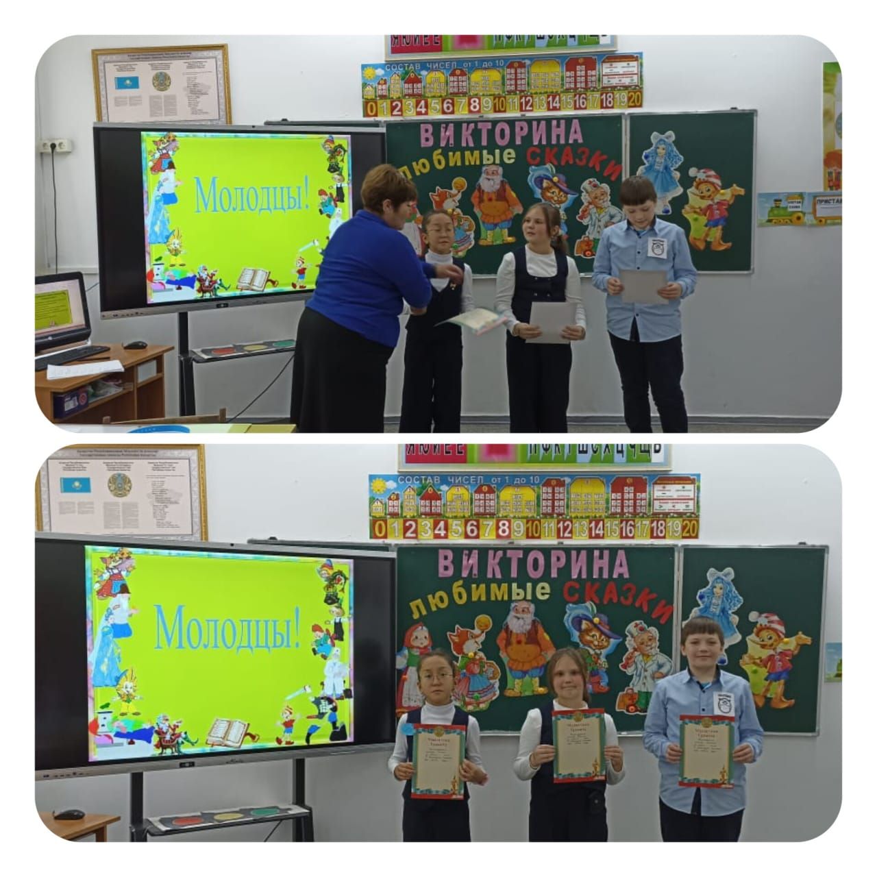 Бастауыш мектеп апталығы аясында 4 сыныптар арасында "Сүйікті ертегілер беттері" тақырыбында викторина өтті.