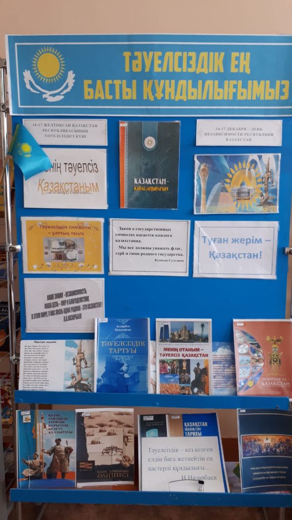 13 декабря 2022 года ко Дню Независимости Республики Казахстана библиотекарь "ШЦДО №5" А.Т.Каримова предлагает для читателей тематическую выставку на тему "Независимость – наша…